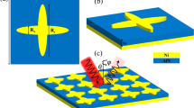 The full wave numerical simulations were carried out using periodic boundary conditions and frequency dependent tabulated dielectric properties of gold24 and silicon dioxide27. We obtained the S parameters (S21 for transmission and S11 for reflection) and the extinction was derived using, as the transmission (S21) is zero due to the thick gold ground plane.
