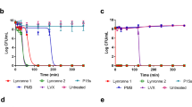 Biofilms were grown for 72 h, at 37 °C in flow chambers with channel dimensions of 1 by 4 by 40 mm, as previously described29. For treatment of pre-formed biofilms, bacteria were allowed to develop structured 2-day-old biofilms prior to treatment with Pa-MAP 1.9, for the following 24 h. The medium used to allow biofilm growth was (BM2) containing 0.4% (wt/vol) glucose as a carbon source. Silicone tubing (VWR, 0.062 in ID by 0.125 in OD by 0.032 in wall) was autoclaved, and the system was assembled and sterilized by pumping a 0.5% hypochlorite solution through the system at 6 rpm for 30 min using a Watson Marlow 205S multi-channel peristaltic pump. The system was then rinsed at 6 rpm with sterile water and medium for 30 min each. Flow chambers were inoculated by injecting 400 μl of an overnight culture diluted at 1:25 (v/v). After inoculation, chambers were left without flow for 2 h, after which medium was pumped through the system at a constant rate of 0.5 rpm for 48 h. After this time, treatments were diluted in BM2 medium at desired concentration and pumped through the system for 24 h. Biofilm cells were stained using the LIVE/DEAD BacLight Bacterial Viability kit (Molecular Probes, Eugene, OR) prior to microscopy experiments. A ratio of SYTO-9 (green fluorescence, live cells) to propidium iodide (PI) (red fluorescence, dead cells) of 1:5 was used. Microscopy was done using a confocal laser-scanning microscope (Olympus, Fluoview FV1000) and three-dimensional reconstructions were generated using the Imaris software package (Bitplane AG).