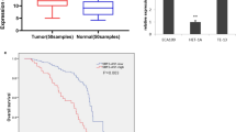Results of IHC staining of tumor and normal tissues were quantitative analyzed with the AxioVision Rel.4.6 computerized image analysis system (Carl Zeiss, Oberkochen, Germany). The stained sections were evaluated at 200× magnification and 10 representative staining fields of each section were analyzed to obtain the mean optical density (MOD), which represents the strength of staining signals as measured per positive pixels, as previously reported38,39,40,41. In brief, stained slides were evaluated at ×200 magnification using the SAMBA 4000 computerized image analysis system with Immuno 4.0 quantitative program (Image Products International, Chantilly, VA, USA). Ten representative staining fields per tumor sample were analyzed to determine the MOD, which represents the concentration of the stain as measured per positive pixels in the whole tissue. A negative control in each staining batch was used for background subtraction in the quantitative analysis. The MOD data were statistically analyzed using the t-test to compare the average MOD difference between different groups of tissues; P < 0.05 was considered significant.