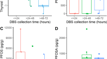 The serum samples were extracted using a modified version of the ion-pair extraction method developed by Hansen et al.66. A serum sample (0.5 mL) was mixed with internal standard solution (PFASs, 1 ng; precursors, 100 pg), 0.5 M tetra-n-butylammoniumhydrogen sulfate (TBA) solution (1 mL, adjusted to pH 10 with 2 mM sodium hydroxide solution) and 0.25 M sodium carbonate buffer (2 mL) in a 15 mL polypropylene tube. Methyl-tertbutyl ether (MTBE) (5 mL) was added to the solution for extraction. The organic and aqueous layers were separated by centrifugation. The aqueous mixture was rinsed twice with MTBE. All rinses were combined in a second polypropylene tube and evaporated at ambient temperature under nitrogen gas flow, and then reconstituted in 0.25 mL of methanol/water (1:1). The supernatant was filtered through a 0.2 μm nylon filter before analysis.