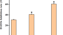 The mushroom tyrosinase was used for in vitro bioassays as described previously with some modifications58,59. Briefly, 140 μl of phosphate buffer (20 mM, pH 6.8), 20 μl of mushroom tyrosinase (30 U/ml), and 20 μl of the inhibitor solution were placed in the wells of a 96-well plate. After pre-incubation for 10 min at room temperature, 20 μl of L-DOPA (3,4-dihydroxyphenylalanine) (0.85 mM) was added and the plate was further incubated at 25 °C for 20 min. Subsequently the absorbance of dopachrome was measured at 492 nm using a micro plate reader (OPTI Max, Tunable). Kojic acid was used as a reference inhibitor. The extent of inhibition by the test compounds was expressed as the percentage of concentration necessary to achieve 50% inhibition (IC50). Each concentration was analyzed in three independent experiments run in triplicate. The IC50 values were determined by the data analysis and graphing software, Origin.