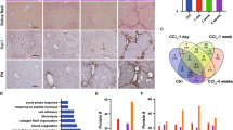 Liver cirrhosis was induced using diethylnitrosamine (DEN) (Sigma, NO756), as previously reported35. Mice received normal drinking water that contained 0.014% DEN, 6 days/per week for 15 weeks. The 1st cohort of 30 mice received DEN for 15 weeks in order to monitor liver progression from normal to fibrotic, cirrhotic and eventually liver cancer (n = 30), as identified by Masson’ Trichrome, picroSirius Red and hematoxylin-eosin (H&E) stainings. Both Masson’s Trichrome and Picrosiriusis are the protocols used in histology for distinguishing cells from surrounding connective tissue such as collagen fibers. The blue or green color of Masson’s Trichrome stained for collagen fibers and the red color of picroSirius Red stained for reticular fibres, the basal laminae of capillaries, the birefringence of collagen fibers and co-aligned molecules of Type I collagen, which may be obscured by Masson’ Trichrome staining. The 2nd cohort of 37 mice was assigned to receive treatment. Prior to transplantation, MLpvNG2+ cells were labeled with carboxyfluorescein diacetate succinimidyl ester (CFSE)71. At 6 weeks of DEN administration, mice were randomly divided into the DEN and phosphate buffered saline (PBS) group (DEN+ PBS) (n = 13), or the DEN and MLpvNG2+ cell group (DEN+ MLpvNG2+) (n = 13). An additional group of age-matched male mice (n = 11) were used as naïve controls. For the DEN+ MLpvNG2+ group, mice were given a tail vein injection of CFSE-labeled MLpvNG2+ cells (1 × 106 cells in 200 μl for each mouse) at 6 weeks of DEN administration. Animals in the DEN+ PBS group received the same volume of PBS (200 μl for each mouse). Both groups continuously received DEN and were monitored for an additional 4 weeks. Upon sacrifice by cervical dislocation, liver samples from each animal were collected and processed: (a) fixed in 4% buffered formaldehyde and embedded in paraffin; (b) snap frozen at −80 °C for sectioning and immunohistochemistry or RNA isolation; and (c) homogenized in appropriate buffer (s) for preparation of cirrhotic conditioned media and for biochemical assays.