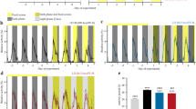 Circadian behavior recordings were conducted in light-tight ventilated boxes (22–23 °C, 19–54% relative humidity). Light (7 μW/cm2/s, 55 lux inside the cage) was generated by green LEDs controlled by Chamber Controller (Phenome Technologies, Inc Chicago, IL USA). Mice were singly housed in plastic cages (length × width x height: 29.5 × 11.5 × 12.0 cm) with running wheels (diameter 11 cm). Wheel revolutions were continuously recorded every minute by the ClockLab system (Actimetrics, Wilmette, IL USA). A passive infrared sensor (product ID 189, Adafruit, NYC, NY USA) located 10 cm above the cage lid was used to monitor general activity in the timed wheel access experiment. Cages and water bottles were changed once every 3 weeks. An infrared viewer (FIND-R-SCOPE Infrared Viewer; FJW Optical Systems, Inc. Palatine, IL USA) was used to perform maintenance and feeding in the dark without exposing mice to visible light.