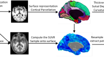 FDG-PET images were obtained at the standardised resolution of 8 mm FWHM, and normalised using the mean intensity in the cerebellar grey matter. T1-weighted MR images at both 1.5 and 3.0 Tesla were included to increase the size of the available sample. A sample specific group-wise space was defined for our analysis using iterative non-rigid registration and averaging the grey matter segmented from the MR images. Registration was performed using the freely available nifty-reg package23, and grey matter and FDG-PET images were resampled to the group-wise space. The resampled grey matter images were modulated by the corresponding Jacobian determinant of the template-to-subject transformation, and subsequently spatially filtered at the point spread function of the PET images and downsampled. Thanks to the modulation and to the downsampling operation, the resulting anatomical areas of apparent ventricular and CSF expansion are associated to smaller voxel-wise intensity values due to the scaling by the Jacobian determinant values.