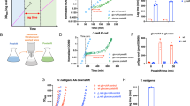 Bacterial cultures were started from single colonies on LB plate and grown until OD600 of 0.8. Resulting seeder culture was used to inoculate the experimental culture to starting OD600 of 0.1, which was grown aerobically into stationary phase (20 ml of medium in 125 ml flasks), kept in stationary phase for 15 h and directly diluted into fresh medium to OD600 of 0.1 or, during shift from LB to M9, harvested by centrifugation and, washed with M9 before transfer into fresh medium. Experiments with inclusion of 1 or 19 amino acids were conducted as follows: after 15 h in stationary phase, cells were harvested by centrifugation (in carbon source experiments washed with carbon source depleted M9), resuspended to OD600 of 0.1 and grown aerobically in fresh medium on 96-well plates in a volume of 80 μl per well. OD600 readings of the 96-well plates (plate reader Tecan Sunrise) were converted to values for 1 cm path length (spectrophotometer Thermo Helios β) (Supplementary Figure 5). The length of the lag phase was determined by an intercept between the initial inoculum density (OD600 = 0.1) and the tangent of fastest exponential part of the growth curve that determines the doubling time. Lag and doubling times were calculated separately for individual growth curves (n ≥ 3). Data analysis was performed in R53 and the code is provided in the Supplementary Information.