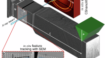An important feature of the setup is the use of a wedge indenter, whose edge is oriented parallel to the beam direction, similar as in our previous ex-situ study19. In this way, the indentation geometry is significantly simplified because the primary X-ray beam oriented perpendicular to the film cross-section penetrates the sample always at constant y and z distances from the indenter wedge (Fig. 1). This implies that the strain magnitude in the irradiated volume is relatively homogeneous, as far as strain relaxations at the lamella borders and the strain variation along the x axis can be neglected. The approach allows for determining the volume-averaged 2D distributions of microstructure as well as strains across the film cross-section at individual indentation steps with the spatial resolution of the beam size.