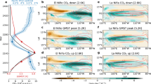 Like ENSO, IOD is generated by a sea surface temperature (SST) dipole along the equator30. In the Indian Ocean, a dipole is established during boreal summer (June–August, Fig. 1), responding to weakening of zonal westerlies, which results in shoaling of the thermocline and cool SST anomalies in the eastern ocean basin (Bjerknes feedback)19,31. The Australian monsoon depression forms in response to the abrupt breakdown of the IOD during the austral spring (September–November)20,31. Thus, the strength of the monsoon system in northern Australia (and its ability to penetrate inland) is dictated by the strength of negative IOD anomalies as the convection centre moves eastward across the equatorial Indian Ocean (Fig. 1). Whilst La Niña events occur during extended droughts in southeastern Australia, there is a notable lack of negative IOD events during drought29. Similarly, very wet periods in southeastern Australia are often associated with negative IOD events29.