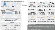 The primary end points of this study were the mean difference in lipid profiles (mmol/L; TC, LDL, HDL and TG). Secondary outcome was the mean difference in BP (mmHg; SBP and DBP). Net changes in each of the study variables, which were calculated from baseline and follow-up means and SDs, were used to estimate the principal effect. Intention to treat (ITT) data from all eligible trials was used in this meta-analysis. Since ITT is intended to avoid various misleading artifacts that can arise in intervention research such as non-random attrition of participants from the study or crossover54. Studies that reported results in mg/dL were converted to mmol/L using the standard conversion factors. The conversion factor was 1 mg/dL = 0.02586 mmol/L for cholesterol, 1 mg/dL = 0.01129 mmol/L for TG and 1mg/dL = 0.056 mmol/L for glucose. These values were captured as mean ± SD. When SDs were not directly available, they were calculated from SE or 95% CI according to the Cochrane Handbook for Systematic Reviews of Interventions55. Other cardiovascular risk factors were also captured in this way, including apo A-I and apo B, BMI, ox-LDL, glucose, HbA1c, IL-6, TNF-α, VCAM-1, ICAM-1 and CRP.