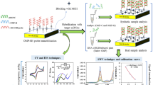 A PS nanofibrous membrane was exposed to argon gas plasmas created by dielectric barrier discharge (DBD) under atmospheric pressure for plasma treatment to modify its surface. First, the PS nanofibrous membrane (d = 5 mm) was attached to the quartz-dielectric reactor (DBD–100A) located at the midpoint of two electrodes to ensure that it would be treated uniformly. Then, argon gas with flow rate of 1.0 L/min was horizontally injected into the plasma system from the side of the quartz-dielectric reactor. The voltage and current was set at 45 V and 2.2 A, respectively and the treatment time was 2 min. After plasma treatment, the PS nanofibrous membrane was soaked immediately in a 100 μL solution containing avidin and GOx for 1 h. After by soaking in a 100 μL biotin-H2 solution at suitable concentration for 1 h, the membrane was placed into a 100 μL Tris buffer solution containing both H1 and target HIV for 16 h. Finally, it was soaked in a 100 μL hemin solution for 2 h to form the hemin/G-quadruplex DNAzyme. The PS nanofibrous membrane was washed three times with Tris buffer after each soaking and all experiments were performed at 25 °C. The prepared DNAzyme/GOx/PS nanofibrous membrane was stored at 4 °C. Optimized concentration of avidin (2.0 μM), GOx (0.2 μM), biotin-H2 (1.0 μM), hemin (4.0 μM) and ABTS2− (2.0 mM) and optimized equilibrium time of 20 min were used unless specified otherwise. The functionalization process for the PS thin film was the same as that for the PS nanofibrous membrane.