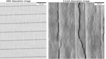 The inter-grating distances l and d (cf. Fig. 1) are equal to 85.7 cm. They were optimised to obtain the maximum visibility for the polychromatic spectrum and do not correspond to a discrete Talbot distance12. The choice of a symmetric setup and a phase grating that introduces a phase shift of π to the wave front is favourable with regard to a better spectral acceptance at higher Talbot orders12,19. The periods of all gratings were 5.4 μm. Smaller grating periods result in higher aspect ratios, which are more difficult to fabricate technically and thus tend to perform worse than gratings with larger periods. In general, one has to take into account the effect of shadowing by planar grating bars. In our case, the source grating was placed 56 cm away from the X-ray source to reduce the effect of shadowing artefacts, which could be otherwise addressed with bent gratings. The gratings were fabricated on 200 μm thick silicon wafers, which cause a loss in flux due to absorption. The filling height of the source and the analyser gratings were approximately 70 μm, respectively. The setup design energy of 27 keV corresponds to a filling height of 5.2 μm gold of the phase grating for a π-shift. The duty cycles of the three gratings are approximately 0.6, which is considered to be optimal on a theoretical basis19. All gratings were developed and fabricated by the Institut für Mikrostrukturtechnik, Karlsruher Institut für Technologie (Karlsruhe, Germany).