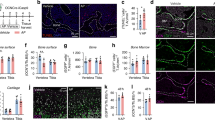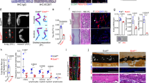 MicroCT analysis revealed that cancellous bone volume was low in the spine and femur of female conditional knockout mice compared to controls (Fig. 1d–l). Femoral cortical thickness was also low compared with Osx1-Cre mice, and this was associated with a reduction in the outer cortical perimeter (Fig. 1m–o). These cortical bone changes were in addition to the effect of the Osx1-Cre transgene alone, which also caused low cortical thickness compared to Atg7-f/f littermates. In line with these results, biomechanical strength of femurs and isolated vertebrae was low, as revealed by 3-point bending and compression testing (Supplementary Fig. S4). Moreover, approximately half of the Atg7ΔOb mice (11 of 23), but none of the control mice (0 of 12), displayed healed or healing fracture calluses in the tibia, indicative of fractures and a profound loss of strength in appendicular bones (Fig. 1p).
