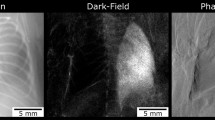 Developing x-ray imaging further, a method has been recently reported that makes it possible to acquire additionally to conventional x-ray absorption information, x-ray phase-contrast and dark-field signals17,18,19. Thereby, information about the small-angle x-ray scattering registered in the dark field19,20 has been shown to significantly increase lung tissue visibility on radiographic images in mice21 and to improve the detection of calcifications in mammographic scans22. The acquisition of this imaging modality is based on the introduction of a three-grating Talbot-Lau interferometer into the x-ray beam. The change in refractive index between tissue and air causes x-rays to be refracted on each air-tissue interface in the lung, resulting in small-angle scattering. Thus, a strong dark-field signal has been observed for healthy lungs in mice21. Moreover, it could be demonstrated that detection of changes to the lung structure can be significantly improved based on dark field compared to absorption x-ray imaging as shown by the analysis of pulmonary emphysema23,24,25,26 and fibrosis27 in mice.