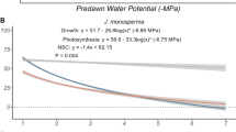 Leaf gas exchange was periodically measured midday with an LI-6400 (LI-COR, Lincoln, NE, USA). Stem respiration rates at the main stem surface were measured daily by the closed-circuit method in the control individuals for each species with an infrared gas analyzer (IRGA; GMP 343, Vaisala, Helsinki, Finland). Leaf water potential before dawn was periodically measured with a pressure chamber (Model 1505-D-EXP, PMS, Corvallis, OR, USA). On the same days, 2 or 3 branches 30–50 cm in length were harvested before dawn, and twigs with 6-mm diameters, recut under water from the branches, were used for the measurements of PLC and NSCs contents. The measurement of twig hydraulic conductivity was conducted by adding gravimetric 5-kPa hydraulic pressure to the end of the examined twigs40. The NSCs content in the xylem sapwood was measured by quantifying the sugar content with the phenol-sulfuric acid method, and the starch content was assessed with the mutarotase-glucose oxidase method using a Glucose C-II test kit (Wako, Tokyo, Japan).