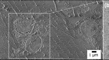 We next compared the cellulose fermenting efficacy of S. cerevisiae strains expressing the EG, CBH1, and CBH2 cellulases via either cell-surface display or secretion. As depicted in Fig. 3a, the cellulase-displaying cells (EG-D-CHB1-D-CBH2-D) showed better ethanol yield (63% of the theoretical yield) from PASC than was seen from cellulase-secreting cells (EG-S-CBH1-S-CBH2-S, 54% of the theoretical yield), which is in good agreement with previous studies21. Based on the SEM observation shown in Fig. 4a, PASC appeared to form a more sponge-like surface material than Avicel. After incubation of yeast cells with cellulose, numerous cellulase-displaying cells (EG-D-CBH1-D-CBH2-D) remained attached to the PASC surface, while very few cellulase-secreting cells (EG-S-CBH1-S-CBH2-S) were retained on the cellulose surface (Fig. 4b). Notably, the adhesion between displayed cells and sponge-like cellulose (PASC) was clearly observed in Fig. 5, showing that the displayed cells are tightly bound to cellulose filaments. Unlike the enzyme-secreting strain, which digests the cellulose via free-form enzymes (such that yeast cell need have no direct interaction with cellulose), the enzyme-displaying strain apparently mediates cellulose degradation via attachment to the cellulose surface, which presumably significantly shortens the distance between microbe and substrate. However, interestingly, no obvious difference in ethanol titer between enzyme-displaying and -secreting cells was observed in Avicel fermentation (around 32% Avicel conversion, Fig. 3b), which may reflect lower binding efficiency of displayed cells to Avicel than to PASC (Fig. 4). We hypothesize that rough, sponge-like structure of PASC provides greater surface area and fine structures, thereby facilitating adhesion of displaying cells and promoting degradation of the substrate. To our knowledge, this is the first report on observation of the adhesion between cellulolytic yeast cells and cellulose.