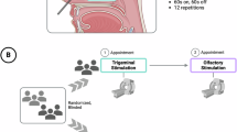 The Sniffin’ Sticks test was performed according to the methods in Hummel, et al.36. For odour presentation, the experimenter removed the cap of the pens and placed the tip of the pen approximately 1–2 cm in front of both nostrils of the participants for approximately 3 s.