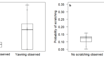 The proportion and frequency of yawning was compared between males and females using a chi-square test and a Mann-Whitney test, respectively. Generalized Linear Mixed Models were used to simultaneously examine the effect of social presence condition, time of testing (range: 0900–1515 h), participant age and hours of sleep the previous night (7.433 ± 1.252 h) on the occurrence of contagious yawning and the urge to yawn without doing so during the experiment (binary logistic). However, testing time, age and hours of sleep were not significant predictors and the best model (based on Corrected Akaike Information Criteria) included only the fixed effect of social presence. Therefore chi-square tests were used to compare the proportion of yawners and those that experienced the urge without doing so across social presence conditions. In addition, a Generalized Linear Mixed Model was used to investigate the effects of these variables on yawning frequency. Similar to above, the best model included only the fixed effect of social presence and therefore a Kruskal-Wallis test was used to compare yawning frequency across social presence conditions. Multiple test corrections were applied to all post-hoc comparisons54.