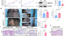 Psoriasis patients with a dermatologist-confirmed diagnosis of chronic plaque psoriasis (12 females and 9 males; age range, 18–59 years; mean age, 32.2 years) and normal volunteers (6 female and 5 male; age range, 21–43 years; mean age, 31.2 years) were recruited for this study. Patient information is shown in Supplementary Table S1. The psoriasis patients required Psoriasis Area Severity Index (PASI) of at least 8 and a typical lesion of at least 1 cm in size that was suitable for biopsy. One 5 mm biopsy was obtained from each normal volunteer. All of the patients enrolled in our study had no other autoimmune or systemic diseases and the target lesion and surrounding 5 cm area were not treated with any therapeutic measures for at least 2 weeks before the biopsy. Skin samples were incubated with 2.5 mg/ml dispase (Gibco, Grand Island, NY, USA) for 8 h at 4 °C to separate the epidermis from the dermis. All participants provided written, informed consent for their participation. The study protocol was designed and carried out according to the principles of the Declaration of Helsinki and was approved by the ethics review board of the Fourth Military Medical University.
