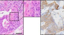 In the invasive tumours, C4.4A was heterogeneously expressed (Fig. 8G,J) and was induced in both histological subtypes developed in this model, namely SCC and UCC. When C4.4A was expressed by invasive strands of tumour cells, these were generally surrounded by a single layer of C4.4A-negative “basal-like” tumour cells (Fig. 8J). This architecture recapitulates the histology observed in other invasive human carcinomas9,10.