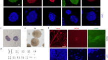 To analyze the relative abundance of mRNA transcripts of pluripotent and differential genes, pESLCs were collected at passage 2 and passage19. Total mRNA was extracted from pESLCs (P2), pESLCs (P19) and corresponding EB, ICMs, PEF (P3) and tissues (brain, liver and muscle) of Landrace pig using the TRIzol Reagent (B5704-1,Takara, Dalian, China) according to the manufacturer’s instructions, followed by treatment with DNase I (2212, Takara, Dalian, China) according to the manufacturer’s protocol. RNA quality and quantity were determined using a Spectro-photometer (NanoDrop 2000c, Thermo Scientific, USA). cDNA was synthesized immediately after using PrimeScriptTM RT reagent Kit (RR037A, Takara, Dalian, China) following the manual supplied by the manufacturer. RNA from ICM of porcine day 7 blastocysts and tissues (brain, liver and muscle) of Landrace pig served as positive control, RNA from STO feeder cell and PEF served as negative control. Q-PCR was performed using Light Cycler PCR QC Kit (Roche, Switzerland) and the 7300 Real-Time PCR System (LC96, Roche, Switzerland). RT-PCR was performed using Veriti 96 cell Thermal Cycler (Applied Biosystems, USA). β-ACTIN served as positive control. PCR primers were listed in Supplementary Table 3. The following PCR conditions were used: 30–35 cycles including denaturation at 94 °C for 30 s, annealing for 30 s and elongation at 72 °C for 30 s, finalized by elongation at 72 °C for 10 min and incubation at 4 °C. PCR products were run on a 1% agarose gel and imaged using a ChemiDoc XRS+ Molecular Imager (Bio-Rad, USA) after staining with ethidium bromide for 5 min.