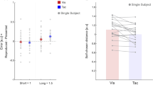We investigated two hypotheses regarding vestibular and visuo-vestibular effects on touch (Fig. 1b). First, a hypothesis of direct vestibular–somatosensory interaction would predict similar effects of vestibular input on tactile sensitivity whether visual input was simultaneously present or not. That is, there should be similar modulation of tactile sensitivity in vestibular and visuo-vestibular conditions. Alternatively, we might hypothesise that somatosensation is modulated by a self-motion signal based on combined visuo-vestibular information. This view predicts that congruent visuo-vestibular stimulation should influence tactile sensitivity less than purely vestibular stimulation generated by chair rotation alone.