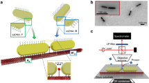 The working principle of the LIQUISOR is illustrated in Fig. 1 (see Methods for details). Gold nanorods (Fig. 1a) are added to a solution of biomolecules dissolved in phosphate buffered saline (PBS, Fig. 1b). The mixture (Fig. 1c) is pipetted in a glass microcell and placed under a Raman micro-spectrometer (Fig. 1d). The volume ratio is kept to 1:7 v/v, small enough to preserve the neutral pH (7.2) of the biomolecules solutions. Upon mixing, the biomolecules bind to the gold NRs63, due to the interplay between the electrostatic interaction with the positively charged cetyltrimethylammonium bromide (CTAB) bilayer of molecules surrounding the NRs, destabilization of the CTAB bilayer at physiological pH64 induced by the PBS and intercalation of the amino acid residues of the protein5,65,66,67. This yields the formation of biomolecule-NRs complexes (BIO-NRCs)68 in which individual NRs are stabilized by the protein layer in the solution. For BSA at room temperature, BIO-NRCs have a mean hydrodynamic radius (MHR) almost double with respect to the pristine NRs, as observed by dynamic light scattering (Supplementary Note 1 and Supplementary Fig. S1a). The MHR does not vary with time, indicating that the dimensions of the NRs, after a fast uptake of BSA from the solution, are stabilized. Extinction spectra confirm this result (Supplementary Fig. S2a), showing that even after 50 min from the NRs-protein mixing, the signal is still dominated by the LSPR fingerprint of individual NRs, characterized by a short axis resonance at 527 nm and a long axis resonance at 687 nm. Only a slight red-shift (1–1.5 nm) and broadening (20 nm) with respect to the original NRs is observed, that can be attributed to the change of local dielectric constant. These results allow us to conclude that the BIO-NRCs in solution are by far composed of individual NRs surrounded by some protein layer. The presence of NRs clusters (dimers or trimers), although cannot be excluded a-priori, has not been detected. Operation of the LIQUISOR is carried out by focusing the laser spot inside the microcell, near the side wall, in proximity of the bottom surface. To foster the aggregation, in fact, the BIO-NRCs must be conveyed optically in a region of few tens of microns. This is achieved by positioning the laser spot as close as possible to the rim of the hemispherical microcell (Supplementary Fig. S3), in the limited free space between the microcell sidewalls and the coverslip so to focus the laser in proximity of the cell bottom surface. We do not observe aggregation or SERS signal when the laser spot is focused into the solution, i.e. far from the side walls, as would be expected if SERS-active small clusters of protein-NRs would be spontaneously formed in the solution. We use a laser wavelength (632.8 nm) blue shifted with respect to the major axis LSPR of the rods at 687 nm (Supplementary Fig. S2b). For particles smaller than the laser wavelength, such as the NRs used in our experiments, the radiation force exerted by a Gaussian beam has two contributions39,48: a gradient force proportional to the gradient of light intensity, and a scattering force proportional to the light intensity and extinction cross section. The first component is conservative, it controls the operation of optical tweezers36,39, and it is generally increased by exploiting high numerical aperture objectives to create high intensity gradients. Instead, the scattering force is non-conservative and it is responsible for pushing particles along the light propagation direction51. We have the optical force components exerted by the laser field on a single NR (see Methods). Calculations are done for the two main configurations in which the field is polarized along the NR long and short axis (Fig. 1e,f, respectively) as a function of the rod position with respect to laser focus center (z = 0)43. For our experimental conditions the scattering force components (blue lines) always prevalent, by at least one order of magnitude, with respect to the gradient forces (red lines), no matter how the nanorod is oriented. The net force balance acting on the rod is, therefore, always positive, i.e. directed along the propagation direction k. This leads to the pushing of the nanoparticles along the optical axis towards the bottom of the cell, as experimentally observed (Supplementary Movie 1). Such process enables the dynamic accumulation of the BIO-NRCs present in solution onto the bottom surface of the microcell, in a zone around the laser focus, where they stick and aggregate, forming structures that can reach the size of several microns. Figure 1h,i show, respectively, the laser scattering image and the bright field image of two optically induced aggregates. Supplementary Fig. S4a displays the time series image of an optically induced aggregate of gold NRs in BSA. Between 0 and 20 min we observe a steep increase of the number of particles in the illuminated spot leading to an enlargement of the aggregate size. After 30 min the aggregate size saturates and reaches a steady state. The aggregate growth kinetics is shown in Supplementary Fig. S4b. Figure 1l shows the SEM image of a large aggregate produced after prolonged irradiation. The respective bright field images, before and after the aggregate formation, are in displayed Supplementary Fig. S5(a,b). A zoom of the SEM image (Fig. 1m) provides information on the BIO-NRCs organization. Sparse rods (cyan box) are visible having lengths of 150–200 nm and widths 80–100 nm, probably composed by individual rods surrounded by some protein layers. Most of the structures, however, show up with a more complex morphology, featuring dimensions in the 250–350 nm range (white box in Fig. 1m and Supplementary Fig. S5d). These structures are likely composed by few rods, surrounded and linked together by the protein. No preferential alignment along the laser field is observed. Some complexes (Fig. 1n) show rods aligned in a side-by-side 