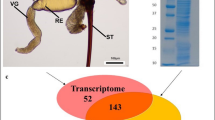 C. vestalis adult females were frozen at −20 °C for 10 minutes and dissected under a stereo microscope (Leica MZ125, Germany) to collect venom gland reservoirs. Fifty pairs of venom reservoirs were opened using forceps in PBS (pH = 7.0) and centrifuged at 8,000 × g for 5 minutes. The supernatant was then collected and run on 15% SDS-PAGE gels. The remaining C. vestalis bodies without venom glands were extracted in SDS-PAGE buffer, centrifuged and supernatants run on the above gel as a negative control. Teratocytes were also collected from 120 parasitized P. xylostella larvae at 6 days post-parasitism and incubated in 1 ml of SFX medium in a 24-well plate for 24 h. The resulting teratocyte conditioned medium was collected and concentrated to 50 μl using an alpha 1-2LD plus freeze drier (Christ, Germany). The proteins in the medium were then separated on 15% SDS-PAGE gels.