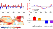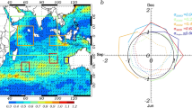 The OGCM used in the present study is the Modular Ocean Model (MOM4p1 with biogeochemistry module), a hydrostatic model using Boussinesq approximation, and having a rescaled geopotential vertical coordinate29. Key physical parameterizations (KPP) include a surface bound which computes vertical diffusivity, vertical viscosity and non-local transport as a function of the flow and surface forcing30. Model has 50 levels in the vertical from surface to 5300 m; the horizontal resolution is 360 × 200 with 1° × 1° longitude and latitudinally varying grid with 0.25° near equator and 0.5° poleward of 10°. Bottom topography is represented by the partial cell method31,32. The biogeochemical model for the simulation of chlorophyll concentration is the Tracers of Phytoplankton with Allometric Zooplankton (TOPAZ) model33,35. The biogeochemical model TOPAZ developed at GFDL has been coupled with MOM4p1. This prognostic ocean biogeochemistry model contains 25 tracers including three phytoplankton groups (diatoms, eukaryotic phytoplankton, diazotrophs), two forms of dissolved organic matter (labile and semi-labile), heterotrophic biomass, detritus, nutrients (N, P, Si, and Fe), dissolved inorganic carbon and alkalinity, dissolved inorganic species for coupled C, N, P, Si, Fe, CaCO3, O2, and lithogenic cycling with flexible N:P:Fe stoichiometry34,35,36. Further details of the model can be availed from Griffies et al. and Dunne et al.29,34. The model has been spun up, and subsequently integrated for 120 years to reach a steady state, by initializing the model with the annual climatologies of temperature and salinity from Levitus36,37 and forced with climatological forcing derived from CORE (Common Ocean-ice Reference Experiments). From this steady state, we carried out an interannual integration for a 62-years using Corrected Interannual Forcing (CIAF) for the 1948–2009 period. Our analysis of model results pertains to the data from this 62-year simulation38.