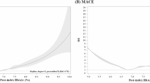 The “diabetes paradox,” i.e., diabetes and glycemic control are not independently associated with mortality in critical ill patients, was proposed by Krinsly et al. and has been continuously observed in other settings8,46,47. The HbA1c level is characterized by lower biological variability and is relatively unaffected by acute stress or sepsis12. Notably, HbA1c values can be affected by anemia and blood transfusion48,49. In patients without diabetes, elevated glucose at admission or acute hyperglycemia was associated with adverse outcomes in patients with acute critical illnesses. Acute hyperglycemia is linked to increased adverse outcomes in patients with trauma42,50, poorer neurological improvement and symptomatic hemorrhage in patients with acute ischemic stroke51, and increased risk of nosocomial complications in patients with community acquired pneumonia (CAP)10,52. Admission basal glucose levels were independently associated with increased mortality in ED patients without a diagnosis of diabetes53. Nonetheless, several studies have reported that the relationship between hyperglycemia and acute illness-related mortality is relatively weak in diabetic critically ill patients54,55,56,57,58. There was no independent association between hyperglycemia and mortality once lactate levels were controlled58. Egi et al. reported that ICU mortality was not associated with diabetes per se or chronic blood glucose control. Freire et al. demonstrated that the highest glucose value during the first 24 h after ICU admission did not predict hospital mortality in the medical ICU59. Patients with chronic obstructive lung diseases treated with corticosteroids developed significant hyperglycemia, but the increase in blood glucose levels did not correlate with the maximum dose of corticosteroids and were not associated with mortality, length of hospital stay, or re-admission rates60. The duration of hyperglycemia or the amount of insulin given did not have a major impact on the outcome of patients with primary acute neuromuscular respiratory failure61. Consistent with our previous work that showed elevated glycemic gaps were associated with adverse outcomes in diabetic patients with liver abscesses, CAP and ICU stays62,63,64, we found that elevated glycemic gaps were also associated with MACEs in diabetic patients with AMI. We speculate that the acute surge of glucose levels beyond the long-term average (or in nondiabetic patients) should be used as a surrogate marker for acute physiological stress. Furthermore, pre-existing hyperglycemia in diabetic patients may be a confounding factor for the prediction of MACEs in patients with AMI.