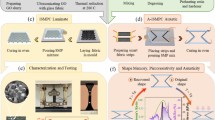 First, ESBO and BFDGE base resin is prepared by mixing these constituents at the appropriate stoichiometric ratios. Next, CNFs are dispersed in acetone by bath sonication and then added to the base resin to form a diluted suspension. The suspension is centrifugally mixed and acetone is removed, yielding a homogeneous, highly viscous, thixotropic ink that is suitable for our 3D printing process. The ink is then loaded into a syringe barrel and extruded through a micro-nozzle to pattern 3D structures (Supplemental video S1). After printing, structures are thermally cured at 80 °C for 16 h and then post-cured at 150 °C for 2 h. Alternatively, origami structures are obtained by a partial cure at 80 °C for 4 h prior to forming the desired structure. A final cure of the origami 3D structures is induced by 80 °C for the remaining 12 h and subsequent post cure at 150 °C for 2 h. The resultant part from either method can now be programmed into arbitrary temporarily shapes by heating it to 80~100 °C for 5 min and applying a stress to deform the sample (Fig. 1h) and maintain the shape until the temperature decreased to 20 °C for 2 min. This programmed part can recover to its original shape simply by resistive heating for 2 min or thermally heating to 80~100 °C again for 2–4 min.