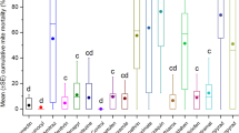 After 3 days of feeding on the different phoretic hosts, the mites were carefully recovered from each worker by using a soft brush and introduced into newly capped (within six hours) worker cells using established methods26 and their fecundity (number of total female offspring) or “fitness” (number of adult and deutonymph females per mother) was determined after nine days of incubation (34 °C, 50% RH). In other words, mite transfer was done at day 1 and mite fecundity was determined on day 10. The experiment was repeated using 2 different colonies during 2008 (Michigan, USA) and 2 colonies during 2009 (Nanchang, China).