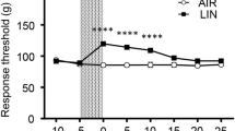 Sensitivity to mechanical stimuli was tested using self-made von Frey filaments71. Mice were individually placed into plastic containers with perforated metal floors (Model 37450, Ugo Basile, Varese, Italy) and acclimated for at least 30 min before testing. A series of 10 filaments (bending forces 0.2~6.8 g in quasi-logarithmic order, 0.5 mm in diameter) was applied to the midplantar surface of the left hind-paw. We applied the weakest filament first, then each filament was applied twice at intervals of 1 min. The threshold was determined as the minimum force eliciting at least one clear withdrawal response of the paw within the two trials.