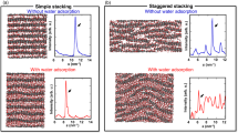 We carried out the production run at constant volume and temperature of 300 K for 5 ns with a time step of 1 fs. We determined the H2O diffusion coefficient from the last 1 ns of data by performing a linear regression to the mean square displacement vs. time. We calculated the radial distribution functions for different pairs of atoms and obtained the number of bound H2O molecules by considering a molecule to be bound if the distance between water oxygen (Ow) and OH group oxygen (Oh) was less than 0.35 nm. A H2O molecule was considered to be free if that Ow was surrounded by four or more Ow within a distance of 0.4 nm. We also determined the extent of clustering of H2O molecules by considering two molecules to belong to the same cluster if the Ow-Ow separation was less than 0.35 nm as discussed previously44,45,46.