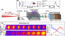 The laser-accelerated e-beams were deflected by a 90-cm-long tunable dipole electromagnet (3.6 m after the exit of the gas jet) with a maximum magnetic field of 1.1 Tesla, corresponding to an energy resolution of 0.06% at 300 MeV with 0.1 mrad divergence and measured by a Lanex phosphor screen (PS) imaged onto an intensified charge-couple device 16-bit (ICCD) in a single shot, which was cross-calibrated by using a calibrated imaging plate to measure the charge of the e-beams43. Before presenting the foil, the electrons’ single-shot far field distribution, directivity and divergence were analyzed and optimized.