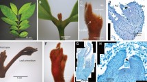 The length of the third leaf on each plant for each cultivar and GA3 or TE treatment was measured using a ruler every day, beginning when the leaf tip just emerged. The REGR was a series of segmental growth rates along elongating leaves and determined by the leaf length increment within 24 h56. The spatial distribution of leaf REGR was determined using a pinhole method10. As previous reports indicated, the spatial distribution of REGR was steady between the emergence of the leaf tip and the transition from blade to sheath growth10. Therefore, a set of 10 plants per replicate was selected when the third leaf shortly emerged. Holes were pinned with fine needles (0.25 mm diameter) through the sheaths of the outer leaves and the first hole is 2 mm from the leaf base. The elongation zone of tall fescue is restricted within the base region of the leaf, and 30 holes spaced 2 mm apart were pierced along the longitudinal axial of leaf. After 24 h, the third leaves were removed from the plant and observed under a stereomicroscope fitted with a camera (Nikon Instruments Inc., model SMZ1270, Melville, NY, USA). The final positions of the holes along the third leaves were recorded using the camera. The relative elemental growth rate (REGR, mm mm−1 h−1) was calculated as described by Arredondo12: REGR = (df − di)/(di × Δt) where df (mm) and di (mm) is the final and initial distances between two holes along the leaves and the Δt (h) is the time period between pinning and observation.