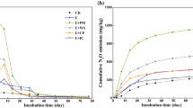 Soil samples (0–10 cm depth) were collected more intensively in the first two months after fertilizer application, a period corresponding to higher N2O emissions. Using an auger, three subsamples were collected as a composite sample per experimental plot. In total, eight soil sampling campaigns were collected at 7, 16, 18, 27, 35, 42, 82 and 158 days after fertilizer application. The soil samples were stored in plastic bags at −20 °C. Gravimetric moisture after constant weight was attained at 105 °C. The water-filled pore space (WFPS) was calculated considering soil bulk density and porosity determined at the beginning of the experiment. Soil pH was measured in CaCl2 (0.0125mol L−1) and NH4+-N and NO3−-N contents were determined by steam distillation after soil extraction in 2 mol L−1 KCl solution39.