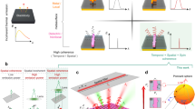 In the second category of standing wave, which we will call Polarization Standing Waves (PSWs), the local polarization state oscillates along the wave axis while the electric, magnetic and total energy densities are invariant. For instance, in the standing wave that is formed by counter-propagating orthogonally linearly polarized waves, the local polarization state is an axial position-dependent ellipse. The degree of ellipticity oscillates and its azimuth flips alternately between orientations at ±45° to the incident polarizations, along the wave axis with a period of λ/2 (λ being the wavelength; see Fig. 1c). Similarly, in a standing wave formed by a pair of counter-propagating circularly polarized waves of the same handedness (as in a cavity formed by ‘handedness-preserving’ mirrors)26, the polarization state is linear with an azimuthal orientation that oscillates along the wave axis with a period λ/2 (see Fig. 1d).