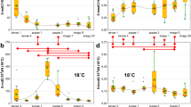 Larvae were sampled after 0, 1, 2, 3 and 7 d- exposures to thermal regimes CLT vs. FTR. In case of FTR, larvae were sampled twice a day, first time at the end of cold period (6 °C, labelled as C) and second time at the end of warm period (11 °C, labelled as T) (see Fig. S1a). Whole larvae (pools of 4 larvae in 6 replications) were homogenized twice in 400 μl of 70% ethanol and the extracts were subjected to complex analysis of major metabolites using a combination of mass spectrometry-based analytical methods as described earlier11. Low-molecular-weight sugars and polyols were determined after o-methyloxime trimethylsilyl derivatization using gas chromatograph (GC) with flame ionization detector GC-FID-2014 equipped with AOC-20i autosampler (both from Shimadzu Corporation, Kyoto, Japan). Profiling of acidic metabolites was done after the treatment with ethyl chloroformate under pyridine catalysis and simultaneous extraction in chloroform53 using Trace 1300 GC combined with single quadrupole mass spectrometry (ISQ-MS) (both from Thermo Fisher Scientific, San Jose, CA, USA) and liquid chromatograph Accela LTQ XL with linear ion trap combined with high resolution mass spectrometers Q Exactive Plus coupled with Dionex Ultimate 3000 (all from Thermo Fisher Scientific). The metabolites were identified against relevant standards and subjected to quantitative analysis by using an internal standard calibration method. All standards used were purchased from Sigma-Aldrich (Saint Luis, MI, USA).