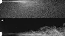 The liquid ejection is initiated by the deformation of the parent drop tip. Consider a certain instant of the collapse and early emission and the portion of the drop’s tip delimited by a reference cross-section with a radial characteristic size λ. The electric current I conducted towards that portion can be calculated as I ~ Kλ2Ez, where Ez ~ (σ/εol)1/2 is the axial electric field due to the quasi-electrostatic Taylor cone shaped along the process18 and l is an axial characteristic length of the cone. The instantaneous electric power W provided by the applied voltage is W ~ IΔV, where ΔV ~ Ezl is the electric potential decay along the distance l. This power is converted mainly into kinetic energy, whose increase per unit time is on the order of the flux ρv3λ2 across the reference cross-section, where v is the characteristic axial velocity in the collapse of the drop’s tip. Taking into account the above expressions, energy conservation demands , which yields