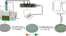 The investigation results for the effect of pH on the determination of the Cd and Pb ions are shown in Fig. 4(c). The pH of the buffer solution has an extreme influence on the formation of the bismuth-metal alloy25. As the best signals appeared at pH 4.5, this pH level was used in subsequent experiments.