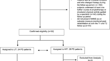 The participants were recruited from medical centers in Taiwan and diagnosed with idiopathic PD by a neurologist. The diagnostic criteria for PD were the presence of at least two of four features (resting tremor, bradykinesia, rigidity, and asymmetric onset), one of which had to be resting tremor or bradykinesia40. To be included in this study, participants with PD had to satisfy the following criteria: (a) Hoehn and Yahr stage of I to III, (b) ability to walk independently, (c) stable medication usage, and (d) a score of at least 24 on the mini-mental state examination (MMSE). The exclusion criteria were as follows: (a) unstable medical condition and (b) history of other neurological, cardiopulmonary, or orthopedic disease known to interfere with participation in the study. Written informed consent was obtained from all subjects. The study protocol was approved by the Institutional Review Boards of Taipei City Hospital, Chang Gung Medical Foundation, and Mackay Memorial Hospital. The methods were carried out in accordance with the approved guidelines. This trial was registered at http://www.anzctr.org.au/ (ACTRN12616000198426 on February 15, 2016) and conformed to the CONSORT flowchart (Fig. 1) and checklist.