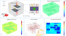 where ξ is the electric field strength and f is the frequency. For embedded capacitor applications, the dielectric loss is an essential parameter. The dielectric loss measured at a given frequency includes polarization loss and conduction loss19. The loss tangent as a function of frequency for the BT–Fe3O4/PVDF composites is shown in Fig. 8a. It can be found that the dielectric loss remained low (tanδ < 0.3) over the whole frequency range. The conduction loss is caused by charge flow through the composites, which depends on the electric conductivity of the composites. As shown in Fig. 8c, the conductivity of the composites with a filler loading of 5 vol.% remained low (5 × 10−11 S/cm) because the absorbed insulating polymer chains act as the dielectric barrier governing the tunneling conduction and make it impossible for complete contact between the nanoparticle clusters34,35. The conductivity of the BT–Fe3O4/PVDF composites increased as the BT–Fe3O4 loading increased. The conductivity increased from 5 × 10−11 S/cm to 1.4 × 10−9 S/cm at 100 Hz, indicating that a conducting path was not formed in the composites, in agreement with the low dielectric loss (shown in Fig. 8a). As shown in Fig. 8b,d, a relatively low dielectric loss (0.3) and a low conductivity (4.12 × 10−9 S/cm) were obtained when the volume fraction of BT–Fe3O4 was 33 vol.%. Compared with the BT–Fe3O4/PVDF composites, the BT–Fe3O4/PVDF# composites exhibited a substantial increase of dielectric permittivity, a slight increase of dielectric loss as well as a slight increase of conductivity. In general, percolative composites can exhibit very high dielectric constants at the proper filler loading. However, these composites also exhibit a relatively high conductivity due to the insulator–conductor transition near the percolation threshold. In the present study, the insulating BT particles lower the probability of the Fe3O4 particles coming into contact because they are discontinuous and discretely fixed on the BT surface. The BT–Fe3O4 hybrid particles made it difficult for the Fe3O4 particles to form a complete conductive network throughout the whole system, resulting in composites with high dielectric permittivity, low dielectric loss, and low conductivity.