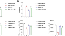 As a pan TRPC1/4 inhibitor, SKF96365 has been widely used32,33,34. However, in most of the reports, SKF96365 was used to treat detached tissue or cultured cells32,33,34. To explore s suitable dosage of SKF96365 for in vivo experiment, especially for this SAH model, we performed preliminary experiments. Briefly, TRPC1/4 inhibitor SKF96365 (B6616, Apexbio Technology LLC, US), prepared in DMSO at a concentration of 10 mM, was injected intraperitoneally at a dose range of 0.5–2.0 mg/kg body weight. In the experiment, we found that SKF96365 at 1.0 mg/kg body weight could effectively decrease the protein level of TRPC1/4 (data not shown). Then, we chose the dose of 1.0 mg/kg body weight in the following study. CN agonist chlorogenic acid (CHA, C3878, Sigma-Aldrich Co.LLC, US), prepared in DMSO at a concentration of 10 mM, was injected intraperitoneally at a dose of 1.0 mg/kg body weight46. In vitro experiment. CN antagonist FK506 (B2143, Apexbio Technology LLC, US) was prepared in DMSO at a concentration of 1 mM and was used to inhibit the activation of CN in culture neurons at a final concentration of 1 μM36. CN agonist CHA was prepared in DMSO at a concentration of 10 mM and was used to activate CN in culture neurons at a final concentration of 10 μM47.