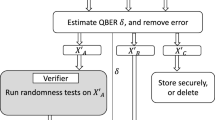 There is strong intuition in support of the correct operation of this protocol. First, the random sampling for s preserves with high probability the min-entropy rate35. Second, an extractor cannot extract almost-uniform randomness if the source has min-entropy much lower than the estimated one. Finally, NIST tests exhibit a certain ability to detect non-uniformity. Verification of the estimated parameters is done by cross-validation.