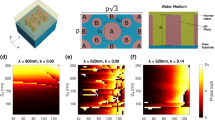 To experimentally verify the performance of the designed dual-wavelength metasurface-based deflector, the aforementioned metasurface device composed of 24-building-block supercells was fabricated (see Methods) and measured. The supercell is repeated 5 times in the x-direction and the whole structure along the x-axis is repeated 120 times in y-direction, thus the whole size of the fabricated sample is 1.44 cm × 1.44 cm. As the schematic diagram of the experimental arrangement shown in Fig. 4a, a fiber based angular resolved terahertz time-domain spectroscopy (THz-TDS) was employed to measure the light deflection of the dual-band metasurface sample46. The terahertz radiation was generated by a photoconductive switch-based antenna, optically pumped by an 800 nm femtosecond laser. Then the terahertz beam was collected by a parabolic mirror and passed through a 90° polarizer. A linearly polarized terahertz wave is reflected and filtered by an aperture with 1.6 cm opening before illuminating the sample. Another two polarizers with 0° and 45° installed after the sample enable a cross-polarization transmission measurement. The signal is referenced by a bare silicon wafer measured with co-polarization. The linear electric fields at each step are labeled as a red arrow shown in the figure. Finally, the signal was detected by a fiber based terahertz receiver, optically pumped by the same femtosecond laser as the transmitter. By mounting the receiver on a metal holder, it allows an accurate arc rotation on its center. With the sample fixed in the center, the measurement was carried out angle-resolved by every 2° from 0° to 34°. The image of a portion of the fabricated sample is shown in Fig. 4b. The 8-cell supercell for top layer (as highlighted in Fig. 4b) is the same as in Fig. 3a. The deflection effect from 0.25 to 1.4 THz can be characterized in a single THz-TDS measurement at a specific detection angle. Figure 4c shows the measured transmission amplitude against frequency at the receiving angles of 0°, 12°, 14°, 16° and 18° (the complete measured data sets are plotted in Supplementary Figure S7) and Fig. 4d shows the measured transmission amplitude against receiving angle extracted from Supplementary Figure S7 at 0.399, 0.403, 1.248 and 1.251 THz.