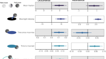 To define day and night-time, we calculated for each day, when the morning and evening civil twilight occurred using the function “crepuscule” from the R package “maptools”55. This function estimates for a given date and coordinate when the geometric centre of the sun is 6° below the horizon in the morning (civil dawn) and in the evening (civil dusk). Daytime was defined as period of time between dawn and dusk, and night-time corresponded to the period of time between dusk and the consecutive dawn.