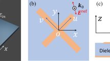 All the metasurface specimens are fabricated by standard printed circuit board (PCB) technology and characterized in the anechoic chamber. The transmission parameters are measured by a couple of CP horns (8–12 GHz) connected to the transmitted and received ports of a vector network analyzer (Agilent 8722ES). The sample is in the middle of two horns whose distance is about 1 m to obtain an approximating plane wave. The measurements of abnormal refraction and magnetic field distributions are conducted by 3D near field scanning system, as shown in Fig. 4a. An electrically small shielded loop (magnetic dipole) with a diameter of 5 mm or a CP horn connecting to receive port of Agilent 8722ES is mounted a 3D turntable whose position is controlled by a stepper motor and record the data with a 2 mm × 2 mm resolution in the xz-plane.