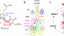 Phytochromes share a modular domain architecture. The widely conserved photosensory core module usually consists of PAS (PER, ARNT, SIM), GAF (cGMP phosphodiesterase, adenylate cyclase, FhlA), and PHY (Phytochrome-specific GAF related) domains5. The PAS and GAF domains hold a tetrapyrrole bilin chromophore, represented by phytochromobilin, phycocyanobilin, or biliverdin in plants, cyanobacteria, or bacteria, respectively. The chromophore is covalently attached via a thioether linkage to a conserved cysteine in either the PAS domain (bacteria) or GAF domain (cyanobacteria and plants) (Fig. 1).