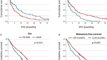 Among the 100 patients in this study, 82 died after a median follow-up of 35 months. The median OS was 9.6 months (95% confidence interval: 8.1–14.2) (Fig. 1). Survival was 75% (95% CI: 67–84%) at 6 months, 44% (95% CI: 36–56%) at 1 year, 25% (95% CI: 18–36%) at 2 years, and 12% (95% CI: 6–22%) at 3 years. Eighty-three patients had disease progression on phase I treatment and 3 others died on study, for a total of 86 PFS events. Four patients came off trial by withdrawing consent, 3 due to toxicity, and 1 each for planned surgery and radiation therapy; 5 patients were continuing on phase I treatment. The median PFS was 3.5 months (95% confidence interval: 2.4–4.7) (Fig. 2). The PFS was 57% (95% CI: 48–68%) at 3 months, 36% (95% CI: 28–47%) at 6 months, 24% (95% CI: 17–35%) at 9 months, 19% (95% CI: 13–29%) at 1 year, 9% (95% CI: 4–20%) at 2 years, and 5% (95% CI: 1–16%) at 3 years. Table 5 presents the analyses of PFS and OS in various subsets of patients. Overall survival were better among patients with fewer than 3 metastatic sites, normal lactate dehydrogenase (LDH) values, and/or normal albumin values. The RMH prognostic score, a standardized system that includes these 3 parameters, was associated with PFS (log-rank p-value 0.0081) and OS (log-rank p-value < 0.0001). Patients who received cytotoxic chemotherapy as a component of their phase I trial treatment had shorter OS than those who did not receive cytotoxic chemotherapy (log-rank p-value 0.039).