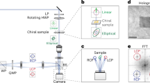 In a macroscopic (or classical electromagnetic) picture, optical activity arises from the difference between the complex refractive index for left circularly polarized (LCP) light and that for right circularly polarized (RCP) light. Optical rotation (OR), also referred to as circular birefringence (CB), is attributed to the difference in the real part of the complex refractive index and involves the rotation of the polarization plane of incident linearly polarized (LP) light. In contrast, CD stems from the difference in the imaginary part of the complex refractive index and converts the incident linear polarization into elliptical polarization. Compared with linear birefringence (LB) and linear dichroism (LD), which originate in the anisotropy of materials against linear polarization, the signal intensities of CB and CD, which involve an optical response to circular polarization, are usually two or three orders of magnitude smaller4,5. In commercial CD spectrometers (Fig. 1a)6, polarization modulation method with a photoelastic modulator (PEM) is commonly adopted to enhance sensitivity. During the modulation, the polarization continuously changes from left circular polarization (LCPn) to right circular polarization (RCPn) through linear polarization (LPn). Therefore, the LP component in a particular direction is involved in the polarization modulation at any time. Various non-ideal properties of the apparatus, such as the non-linear response of optical elements, residual strain in the light modulation device, and higher harmonic responsiveness of the lock-in amplifier, complicate the exact synchronization of modulation between RCPn and LCPn to lock-in detection. As a result, an artefact signal resulting from the LP components is commingled in the signal7,8. In CD measurements, one must pay careful attention to commingling of the false signals arising from LB and LD, unless the sample is isotropic.