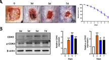 The wounds images were collected using digital camera (Nikon J2, Tokyo, Japan) every day until the wounds closed completely. The morphometric analysis of the wounds was assessed using images of the wounds at days 0, 1, 3, 7, 10, 14, 17 and day 21 post-operatory to measure the remained wound area using Image J software (NIH, US). The rate of wound closure that represents the percentage of wound reduction from the original wound size was calculated using the following formula: wound area day 0 – wound area (day1, 3, 7, 10, 14, 17 and 21)/wound area day 0 × 100. Values expressed as percentage of the healed wounds. In addition, the tissue samples were harvested from the skin wounds at Days 0, 1, 3, 7, 10, 14 and 21 post-wounding, respectively, under anesthesia, for further usage.